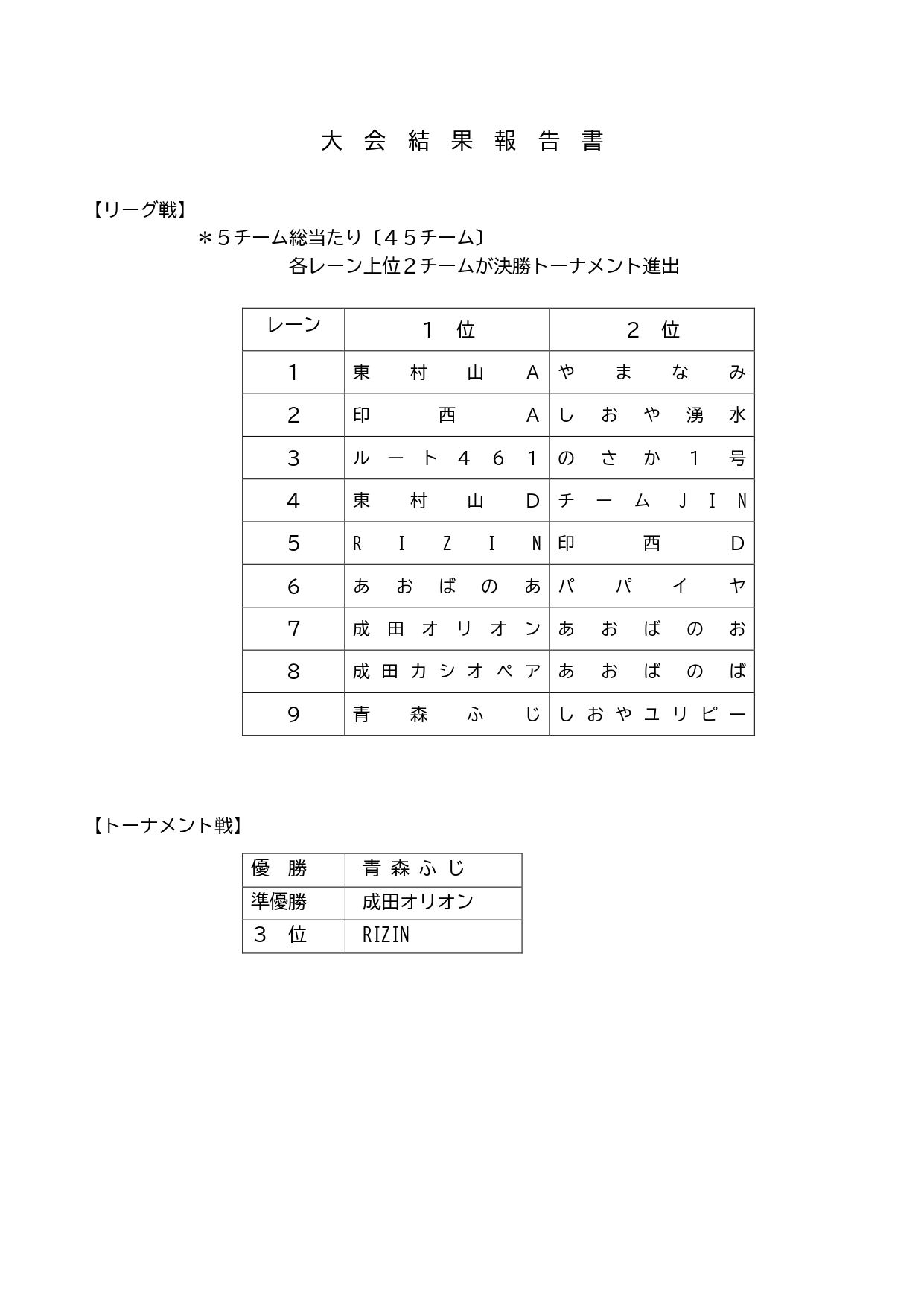 | 結果 | 優勝 青森ふじ 準優勝 成田オリオン 第三位 RIZIN |